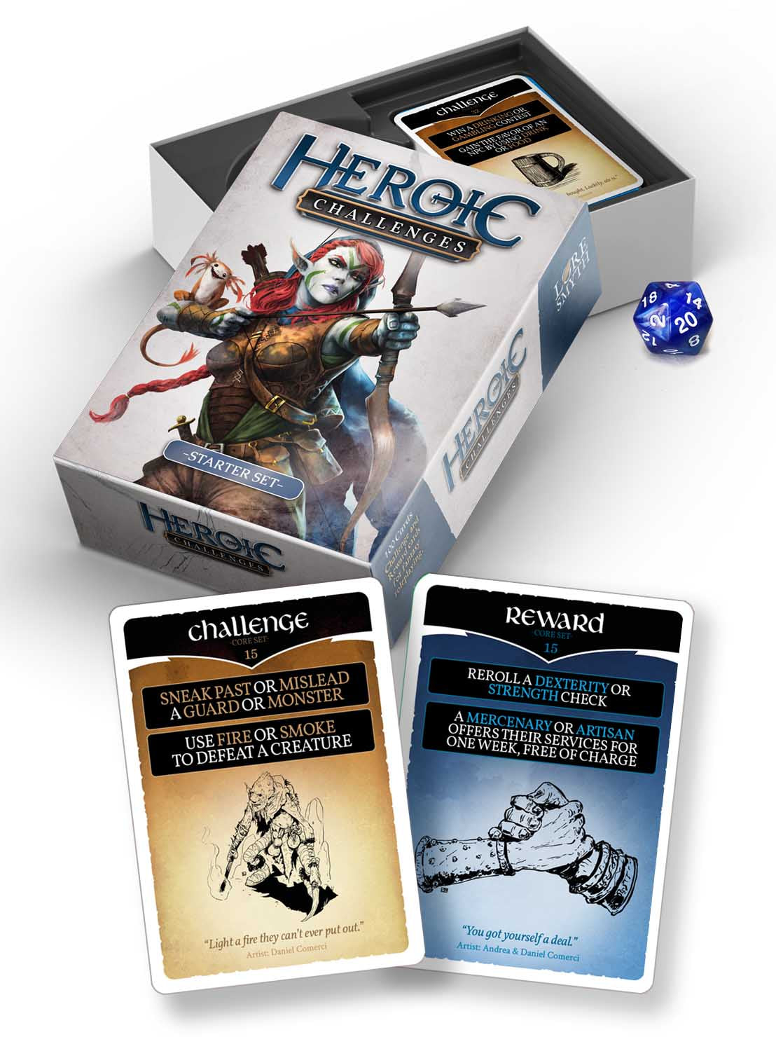 Heroic Challenges cards are for both GMs and Players, which augments game sessions with engaging challenges and rewards. Discover hundreds of prompts that encourage creative play, deepen character choices and give rewards that go beyond gold and XP. Add an exciting new dimension to your roleplaying games, without railroading players or sidelining the GM.